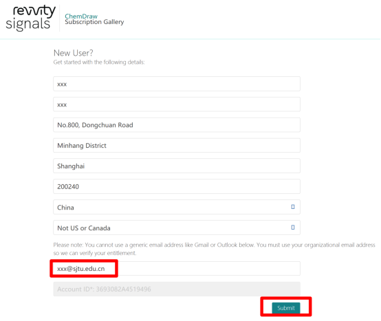 2. 填写后点击submit提交,其中email address必须填写本校域名(@sjtu.edu.cn)的邮箱。