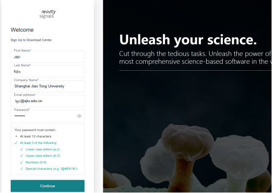 5. 输入个人信息,并设置新密码,点击Continue即登录下载中心 。