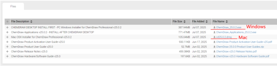 3. 如下页面即是ChemDraw软件安装包的下载位置。Windows用户选择第一个exe文件下载;MAC的用户选择第三个dmg文件下载。
